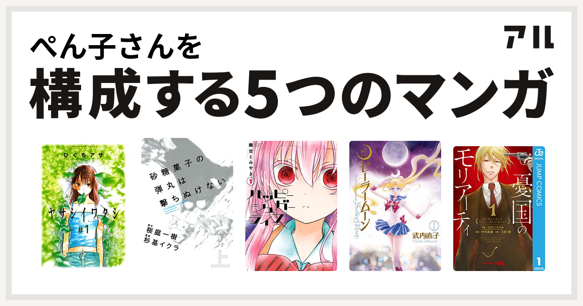 ぺん子さんを構成するマンガはヤサシイワタシ 砂糖菓子の弾丸は撃ちぬけない ハッピーシュガーライフ 美少女戦士セーラームーン 憂国のモリアーティ 私を構成する5つのマンガ アル